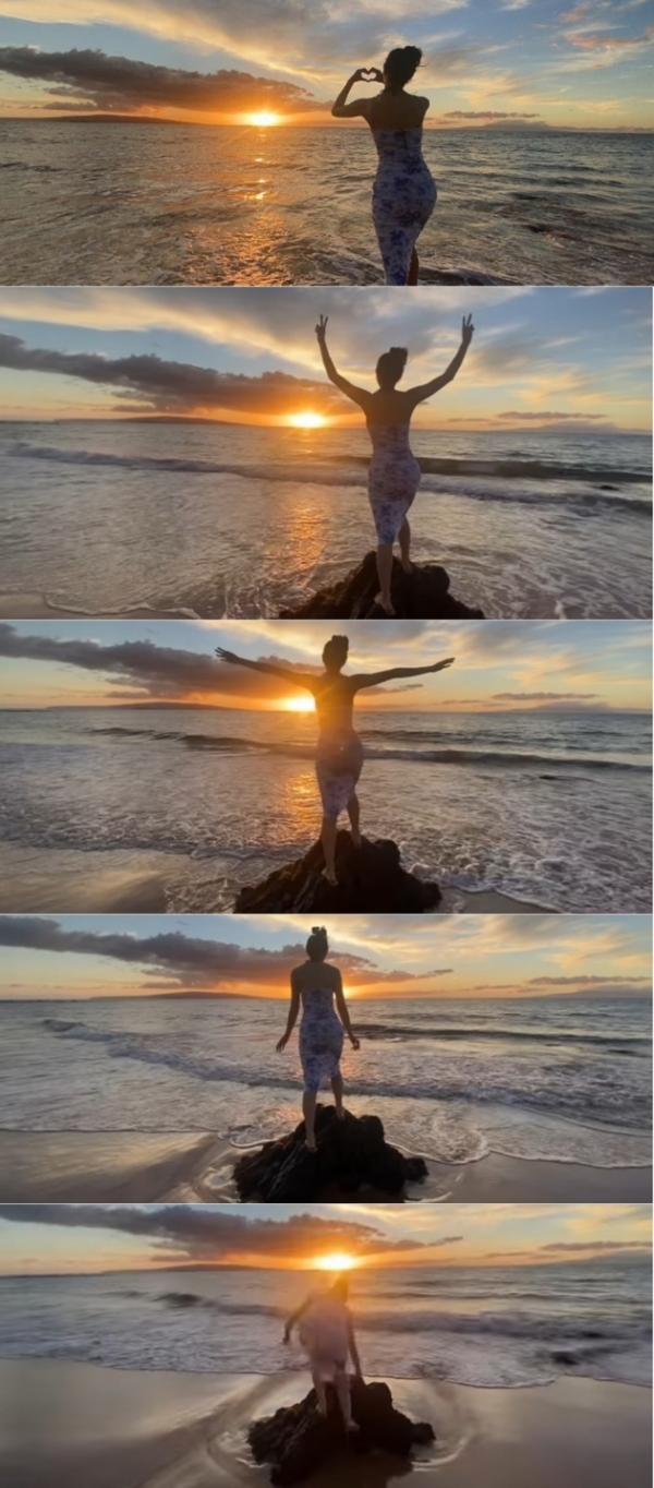 이날 서동주는 낙조를 배경으로 바다에서 하늘을 향해 손 하트를 그리는 등 다양한 포즈를 취하고 있다.