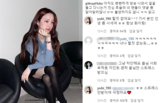 그러자 한 팬은 이유비를 걱정하며 "그냥 차단해라. 사회 부적응자인듯. 괜히 이유비 님만 스트레스 받는다"라고 조언했다. 이유비는 "스트레스 안 받는다. 걱정마라"라며 팬을 안심시켰다.