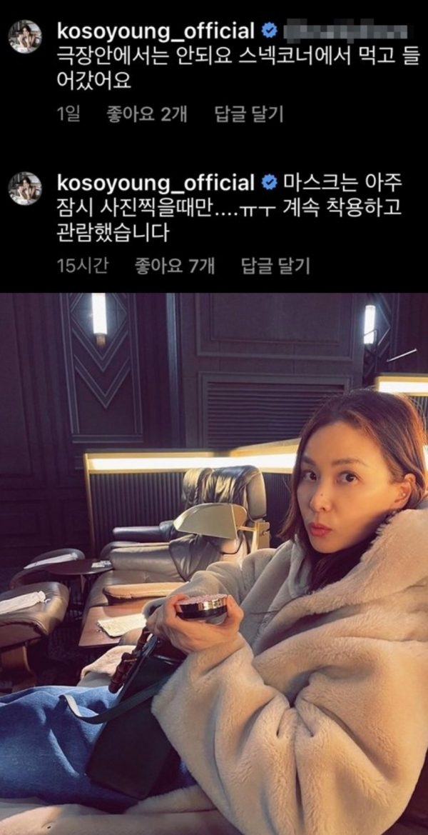 이에 고소영은 "마스크는 아주 잠시 사진 찍을 때만....ㅠㅜ 계속 착용하고 관람했습니다"라는 댓글을 통해 직접 해명했다. 고소영은 음식 취식과 관련해서도 "장안에서는 안돼요. 스낵코너에서 먹고 들어갔어요"라고 설명했다.