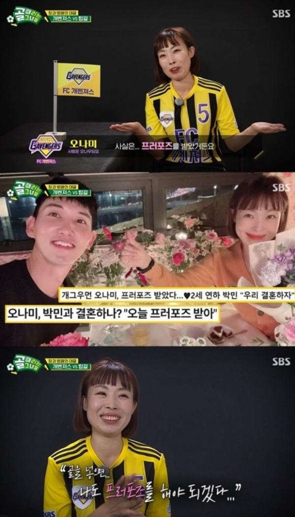 12일(어제) 방송된 SBS ‘골(Goal) 때리는 그녀들’에서 ‘FC개벤져스’의 오나미는 ‘FC탑걸’을 상대로 골을 넣은 후 박민을 향한 ‘프러포즈’ 세리머니를 선사해 눈길을 끌었다.