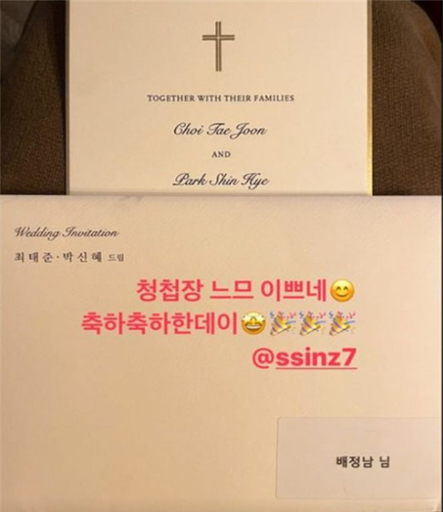 해당 사진에서는 청첩장과 청첩장 봉투가 찍혀 있었는데, 청첩장 봉투에 '최태준, 박신혜 드림'이라는 글자가 선명하게 박혀 있었다.