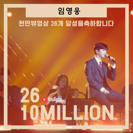 임영웅의 공식 유튜브 채널에 있는 23개의 영상과 TV조선 유튜브 채널에 게재된 2개의 영상, 그리고 모스트 콘텐츠 유튜브 채널에 1개 영상을 포함해 1000만 조회수가 넘는 영상은 이제 무려 총 26개에 달한다.