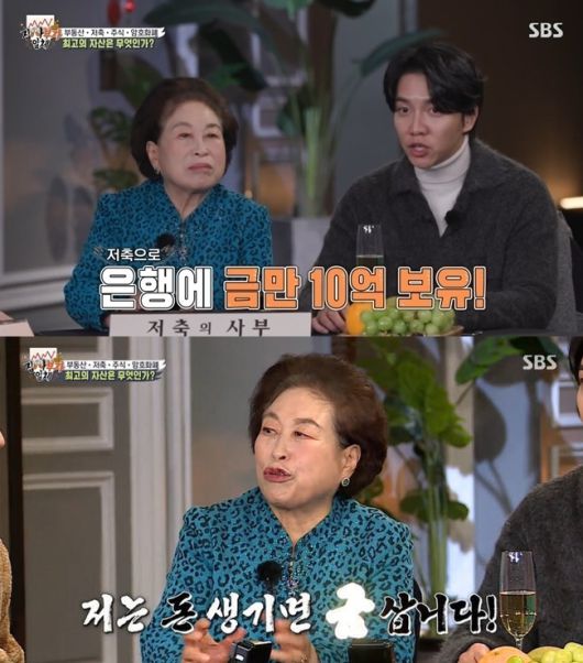 이승기는 전원주에게 "은행에 금만 10억 원 어치가 있다고?"라고 물었다. 전원주는 "돈만 생기면 금을 산다. 티끌 모아 태산이라고 조금씩 모으다 보니까 한 10억 원 모았다"라며 "금은 화끈하다. 가지고 있으면 든든하다. 무거워도 돈이니까 안 무겁다"라고 전했다.
