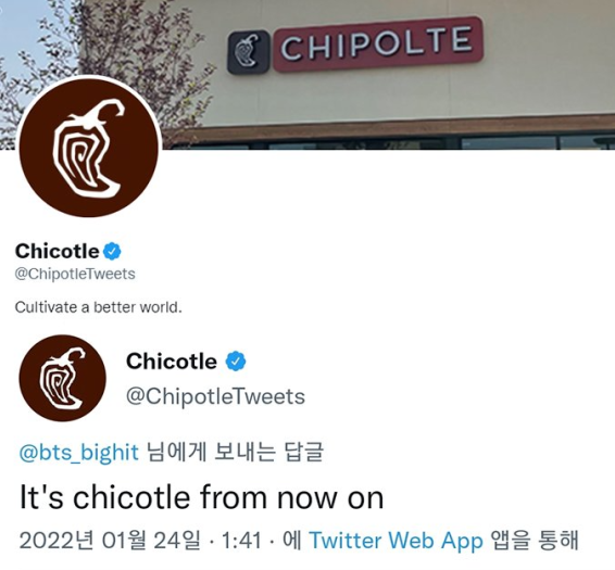 이에 치폴레는 공식 트위터 계정명을 치폴레(Chipotle)에서 치콜레(Chicotle)로 변경하며 "지금부터 우리는 치콜레입니다"라며 방탄소년단 트위터 계정에 답글을 남겼다. 또 "정국이 치콜레라고 하면 치콜레다"라는 게시글을 리트윗하기도 했다.