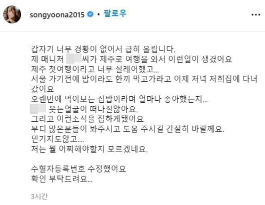 송윤아는 26일 자신의 SNS에 제주로 여행 온 자신의 매니저가 갑작스레 쓰러졌다며 한 게시물을 리그램했다.