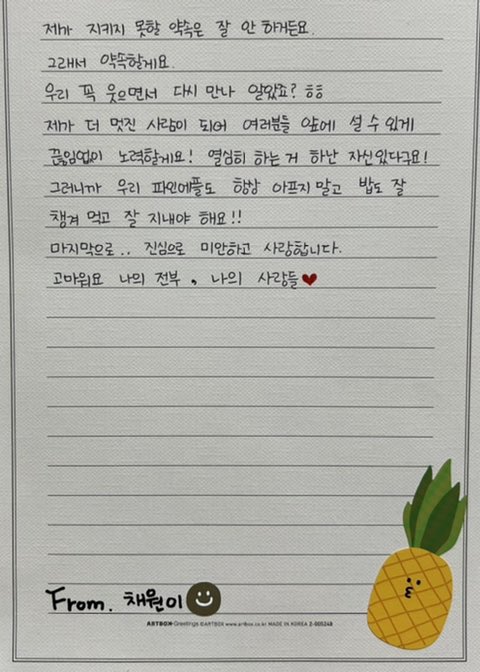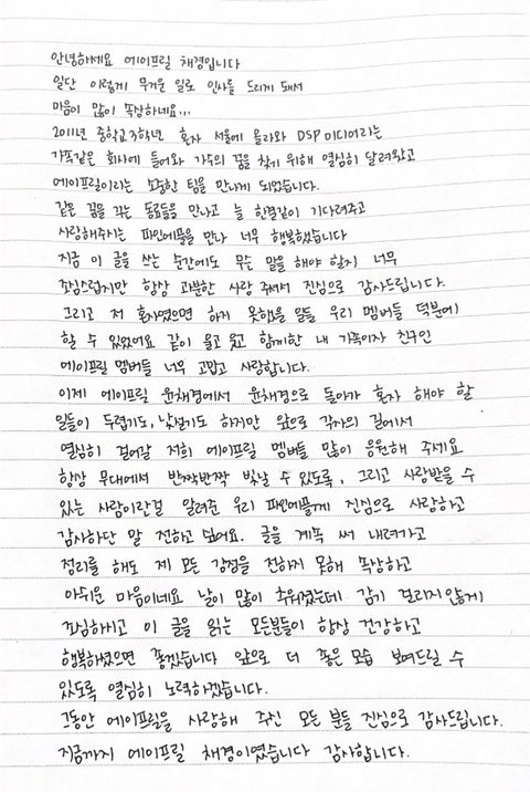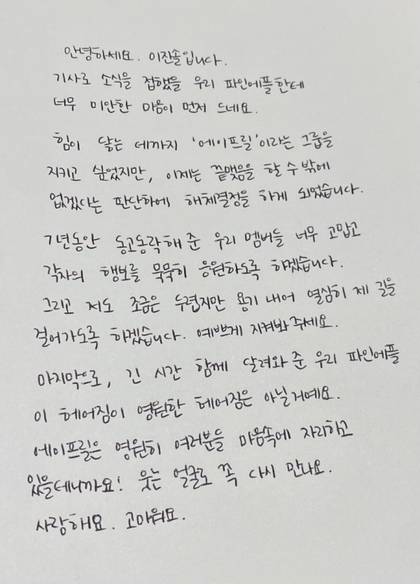 공식 해체 발표 후 에이프릴 멤버들은 팬카페를 통해 팬들에게 손편지를 작성했다. 멤버 채원은 “꼭 다시 무대에 서서 인사드리고 싶었는데 그럴 수 없게 돼서 정말 미안하다. 저 나름대로의 최선을 다해왔다고 생각했었는데 지금 돌이켜보니 후회도 남고, 아쉬운 마음도 크다. 앞으로는 저희가 에이프릴이 아닌 각자의 모습으로 살아가겠지만, 함께여서 빛났던 순간들은 예쁜 추억으로 담아두고 모두의 앞날이 행복하길 바란다”고 전했다.
