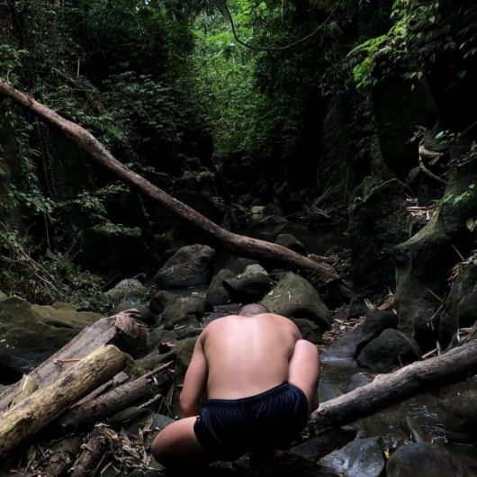 공개된 사진 속 유아인은 자연을 즐기고 있는 모습이다. 유아인의 삭발 헤어스타일이 시선을 집중시킨다.