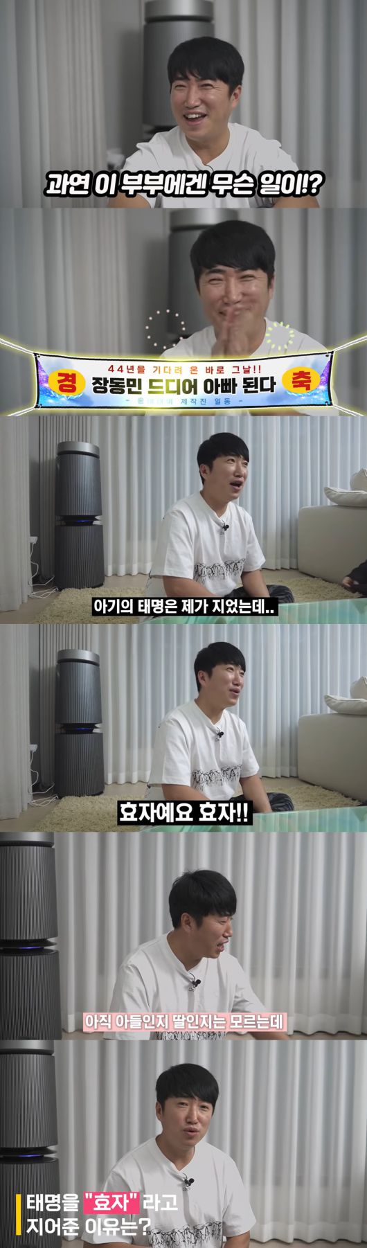 이날 장동민은 "아기 태명은 제가 지었는데 '효자'다. 장모님이 태몽을 꾸셨는데 무조건 아들 같다고 하시더라. 어른들도 다 이건 아들이라고 하셨다"라고 전했다.