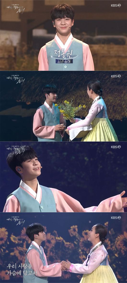 ‘고향의 봄’과 ‘머나먼 고향’을 부르며 등장한 정동원은 어머니의 생신을 맞이해 들꽃을 선물했다. 정동원은 “오늘은 이 꽃뿐이지만, 제가 나중에는 돈 많이 벌어서 어머니 좋아하시는 동동구루무 하나 사드리겠다”라면서 ‘동동구루무’를 열창했다.