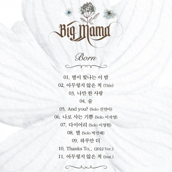 빅마마의 소속사 카카오엔터테인먼트는 4일 빅마마의 정규앨범 ‘Born(本)’의 발매 소식을 전하며 트랙리스트를 공개했다.