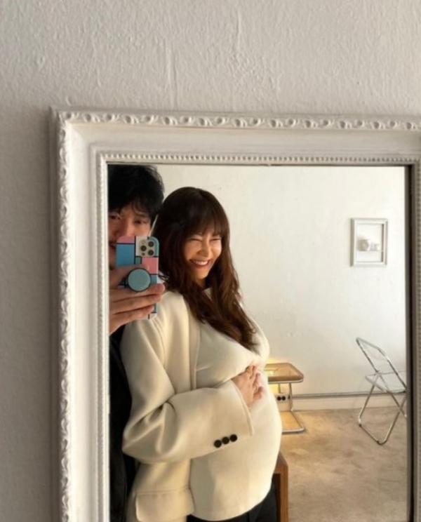 사진에서 양미라는 남편과 함께 사진을 찍고 있다. 둘째의 성별이 딸이라는 것을 안 남편은 함박웃음을 지으며 아내 양미라의 사진을 애정을 듬뿍 담아 찍어줬다.