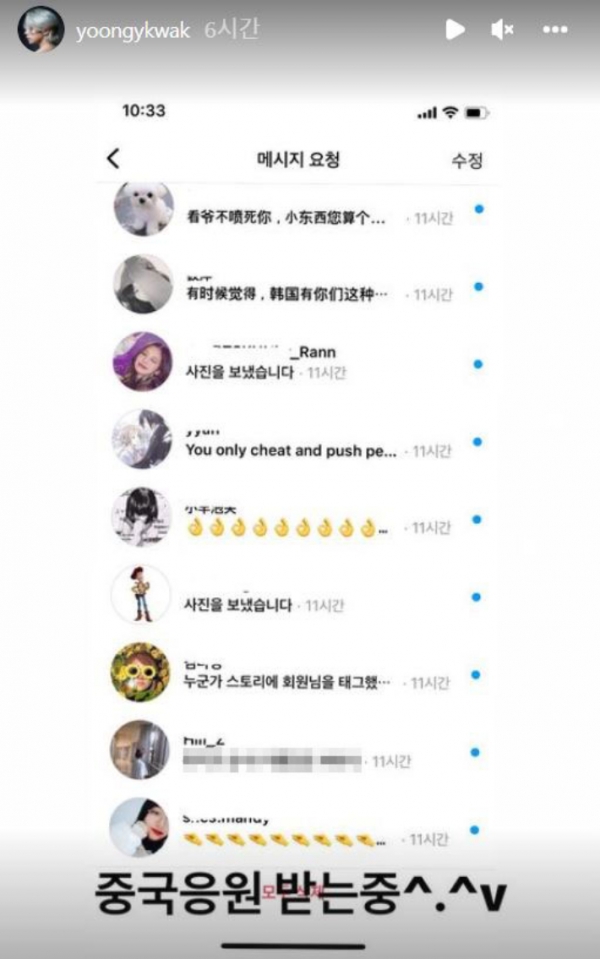 곽윤기는 5일 자신의 소셜네트워크서비스(SNS)에 중국 네티즌으로 추정되는 이들의 욕설 메시지 화면을 캡처해 "중국 응원 받는 중"이라고 대응했다.