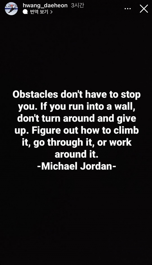 쇼트트랙 황대헌, SNS에 마이클 조던 명언 인용해... “장애물을 만났다고 멈춰야 하는 것은 아니다”