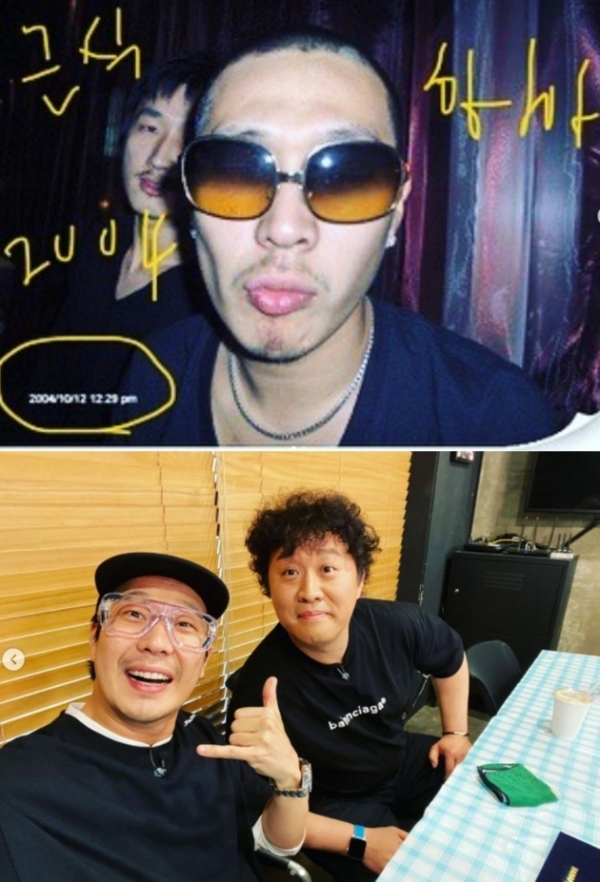 공개된 사진 속에는 지난 2004년 친구 김근식과 삭발 헤어스타일을 하고 있는 하하 모습이 담겨있다. 또 다른 사진 속 하하는 정준하와 나란히 앉아 행복한 표정으로 미소를 짓고 있다.