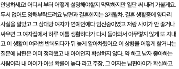 이 글의 작성자는 "남편과 결혼한 지 3개월이다. 신혼 생활 중 양다리 사실을 알았다. 상대 여성이 연예인이고 임신 중이더라. 남편은 나와 다툰 날이면 상간녀 집에서 하루 이틀 생활을 하다 돌아왔다"고 밝혔다.