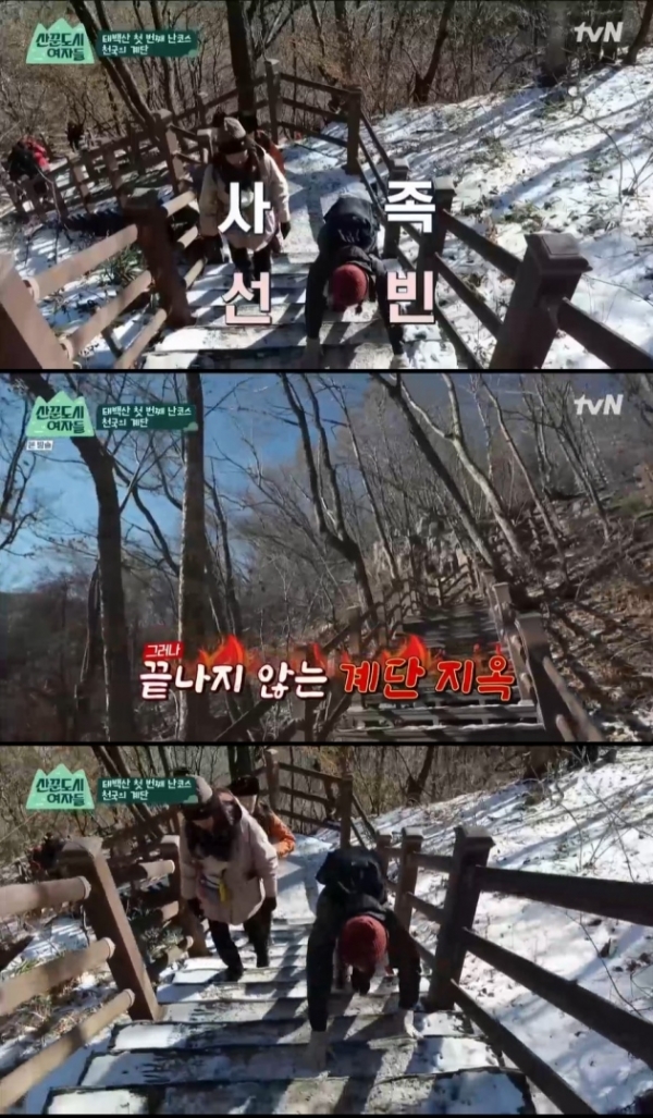 [스타인뉴스 김학철 기자] '산꾼도시여자들' 이선빈이 태백산 계단에서 사족 보행을 선보였다.