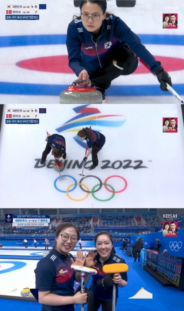 한국은 16일 열린 2022 베이징동계올림픽 여자 컬링 예선 8차전에서 덴마크를 상대로 9엔드까지 6대 7로 끌려갔다. 한국팀은 행운도 따랐다.