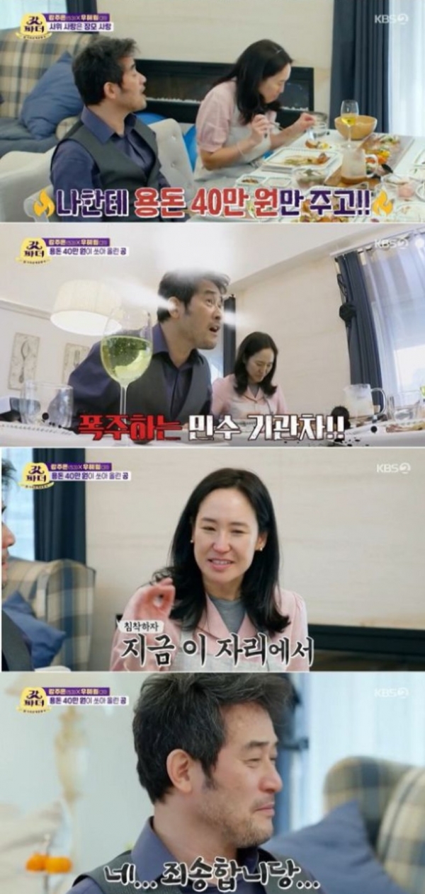 강주은은 "너무 고맙다"고 말하며 최민수를 쳐다봤다. 최민수는 "그렇게 판단 능력이 있는 사람이 한 달에 40만 원만 용돈을 주고, 25년 전부터 내가 번 돈을 착취를 하냐. 난 내돈을 본 적이 없다"고 말했다.