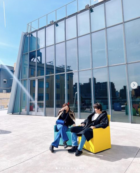 사진 속에는 휘트니 뮤지엄 전시실 곳곳을 돌아다니는 부부의 모습이 담겼다. 두 사람은 야외 의자에 앉아 서로를 향해 다정한 눈빛을 발산하기도 하고, 함께 서서 대화를 나누거나 나란히 걸으며 전시물을 감상하기도 하는 모습이다. 장신에 우월한 비율을 자랑하는 이들은 화보 속 모델들처럼 세련된 분위기를 풍겨 눈길을 끈다.