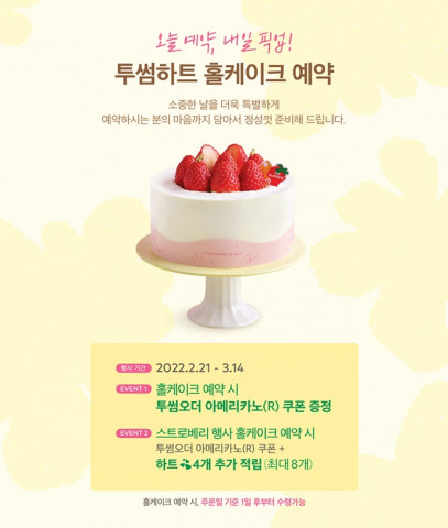 예약할 수 있는 홀케이크 제품은 일별, 매장별로 다를 수 있다. 홀케이크 예약 이벤트에 대한 상세한 내용은 투썸플레이스 모바일 앱 ‘투썸하트’ 이벤트 페이지에서 확인할 수 있다.