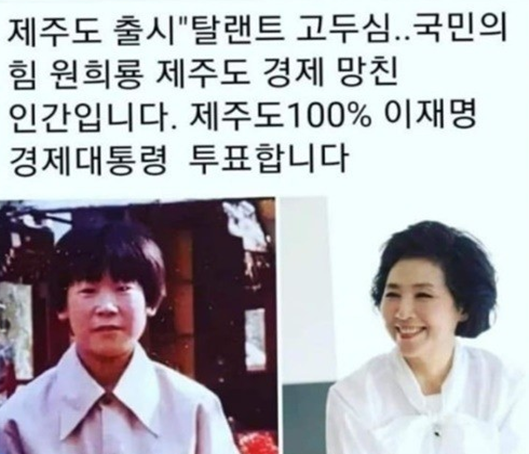논란이 된 게시물은 이재명 후보의 어린 시절 사진과 고두심 사진이 나란히 배열된 채로 위쪽에 "제주도 출신 고두심. 국민의힘 원희룡 제주도 경제 망친 인간입니다. 제주도 100% 이재명 경제 대통령 투표합니다"라는 글이 써 있다.