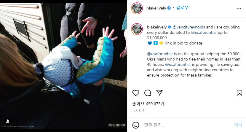 블레이크 라이블리도 개인 인스타그램에 유엔난민고등판무관실(UNHCR)에서 개제했던 사진을 업로드하며 "남편과 나는 @usaforunhcr에 기부되는 모든 달러를 100만 달러까지 두 배로 늘려 기부할 것"이라며 기부 사이트 링크와 함께 우크라이나의 피난민들을 돕자는 메시지를 전했다.