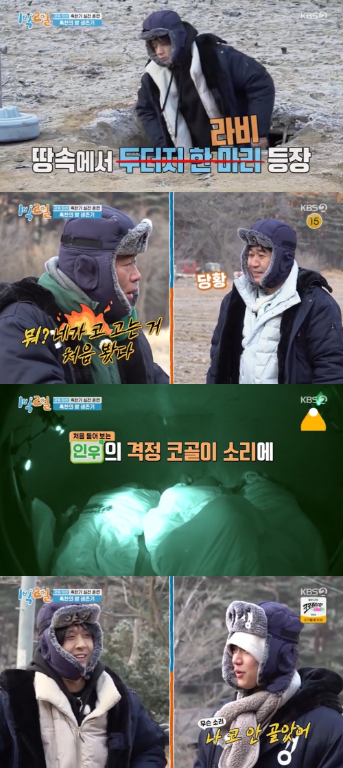 땅박에 당첨된 딘딘과 라비, 나인우는 땅속으로 들어갔다. 아침이 되자 문세윤이 기상 음악이 울리기도 전에 가장 먼저 일어났다. 너무 추워서 깬 것이다. 문세윤은 불을 켜놓고 몸을 녹였다. 문세윤은 사이렌으로 멤버들을 깨웠다. 땅속에 누워있는 동생들도 깨우기 시작했는데 움직임이 없자 걱정했다. 라비와 딘딘, 나인우는 두더지처럼 땅에서 올라왔다. 나인우는 "다시는 여기서 안 잘 거야"라고 말했다.