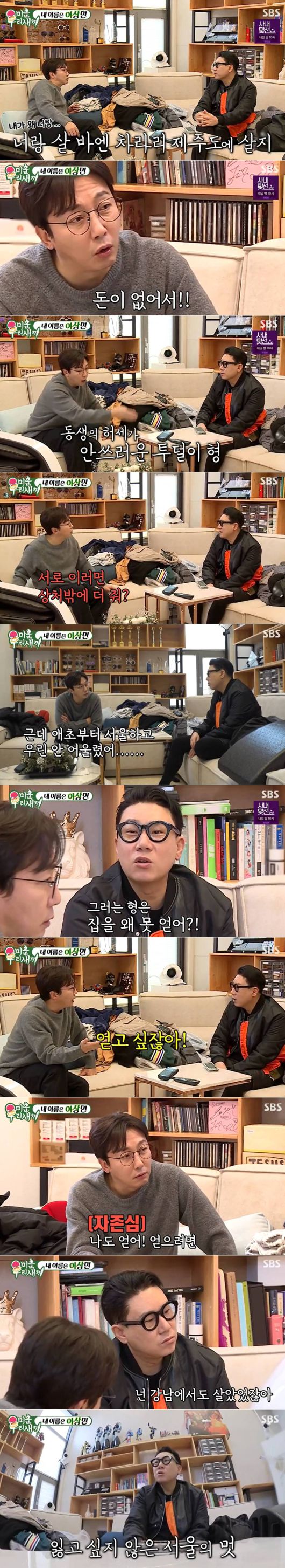 탁재훈은 "나도 고민이다. 언제까지 엄마 집에 있어야 하냐. 맞지 않냐"라고 털어놓자 이상민은 "여기로 와라. 내가 1층 쓸게. 형이 2층 써라"라고 제안했다. 그러나 탁재훈은 이상민의 제안을 딱 잘라 거절하며 "너랑은 안 살지. 여기 오나 제주도 가나 그게 그거인 것 같다"라고 말했다.