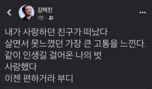 엔씨소프트 김택진 대표이사는 어제(1일) 페이스북을 통해 "내가 사랑하던 친구가 떠났다. 살면서 못 느꼈던 가장 큰 고통을 느낀다"고 전했다.