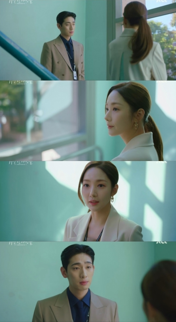 12일 오후 방송된 JTBC '기상청 사람들-사내연애 잔혹사 편'에서는 진하경(박민영 분)에게 이시우(송강 분)와의 관계를 묻는 한기준(윤박 분)의 모습이 그려졌다.