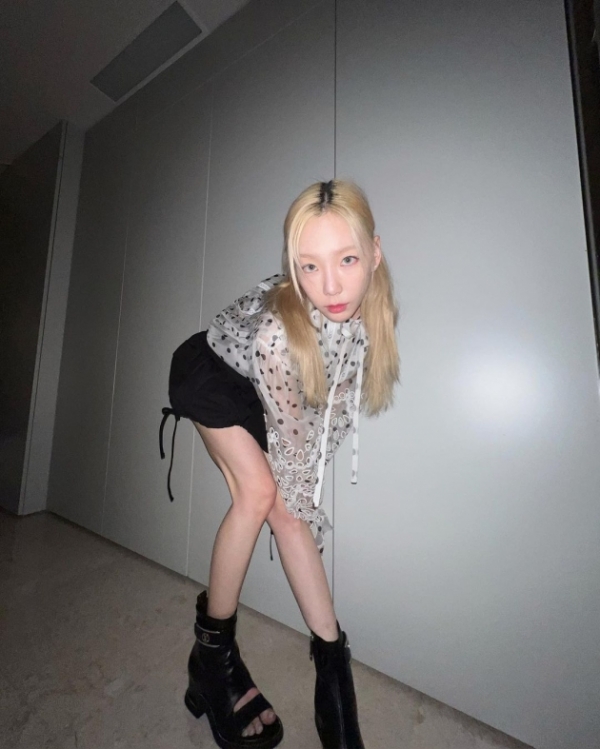 공개된 사진에는 태연이 검은색 도트무늬가 있는 시스루 블라우스를 입고 짧은 하의에 한 명품 브랜드 구두를 신고 포즈를 취하고 있는 모습이 담겼다. 태연은 극세사 다리 라인을 드러내며 시크한 매력을 뽐냈다.
