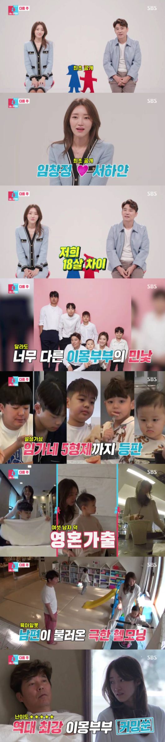 임창정과 서하얀에 이어 두 부부의 5형제가 등장했다. 서하얀은 임창정부터 5형제까지 여섯 남자를 케어하느라 아침부터 영혼이 가출한 얼굴을 보여줬다. 반면에 임창정은 서하얀이 고군분투하는 사이 방에서 느긋하게 핸드폰을 하고 있었다.