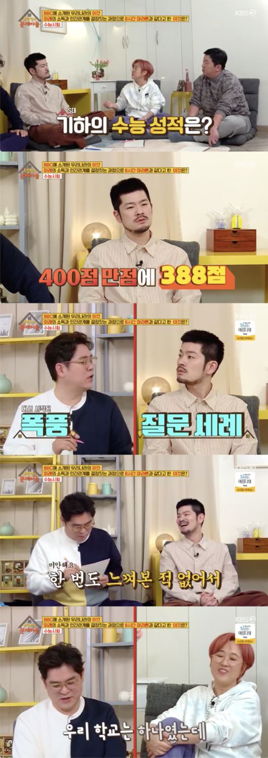 수능 성적을 묻는 질문에 장기하는 “400점 만점에 388점이었다”라고 말했고, 송은이는 “5문제 안쪽으로 틀린거다”라고 답했다. 장기하는 “저는 수시로 들어갔다”라고 덧붙였다. 장기하는 모르는 문제가 있어도 당황하지 않으려고 노력했다고. 장기하는 “침착하려고 노력했다”라고 설명했다.