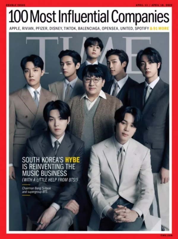 한편, 하이브 방시혁 의장과 하이브 대표 아티스트인 방탄소년단은 이번 ‘세계에서 가장 영향력 있는 100대 기업’ 선정을 기념해 표지 모델로서 타임 커버를 장식했다. 하이브와 함께 100대 기업 반열에 오른 곳으로는 애플과 디즈니, 아마존 등이 있으며 ‘세계에서 가장 영향력 있는 100대 기업’ 선정에 대한 자세한 내용은 타임 홈페이지에서 확인할 수 있다.
