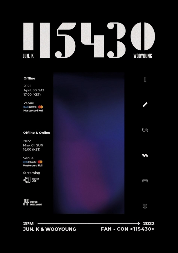 한편, JUN.K와 우영의 팬콘서트 '115430'은 인터파크에서 예매가 가능하다. 팬클럽 선예매는 HOTTEST 8기 골드회원은 12일, 8기 실버 회원은 14일로 해당일자 오후 8시부터 11시 59분까지 진행한다. 일반 예매는 오는 15일 오후 8시부터 오픈한다.
