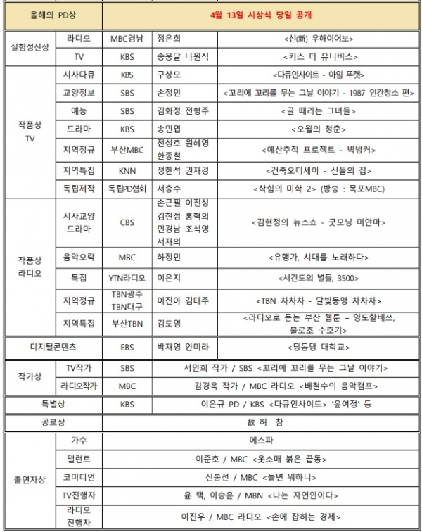 디지털콘텐츠 부문에서는 EBS 웹예능 '딩동댕 대학교' 가 작가상으로는 TV작가 SBS '꼬리에 꼬리를 무는 그날 이야기' 서인희 작가, 라디오작가 MBC 라디오 '배철수의 음악캠프' 김경옥 작가가 상을 받는다. 공로상에는 26년간 KBS '가족오락관'을 진행했던 지난 2월 별세한 故허참이 수상한다.