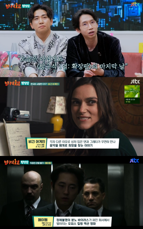 한편 8일 JTBC의 ‘방구석 1열 : 확장판’에서는 가수 겸 뮤지컬 배우 김동완과 뮤지컬 배우 이충주가 출연하여 영화 국민이 사랑하는 음악 영화인 ‘비긴 어게인’과 배우 스티븐 연이 출연한 자칭 직장인 관람 불가 영화인 ‘메이헴’에 대해서 이야기를 나눴다.