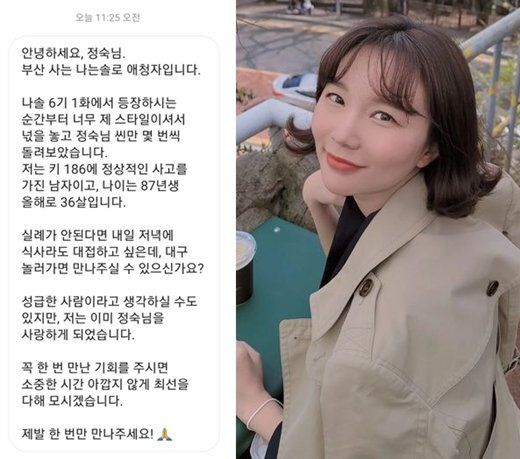 '부산 사는 나는솔로 애청자'라는 인물은 '1화에 등장하시는 순간부터 너무 제 스타일이셔서 넋을 놓고 정숙님 씬만 몇 번씩 돌려봤습니다. 저는 키 186에 정상적인 사고를 가진 남자이고 나이는 87년생 올해로 36살입니다'라며 "실례가 안된다면 내일 저녁에 식사라도 대접하고 싶은데 놀러 가면 만나주실 수 있으신가요?'라며 데이트를 신청했다.