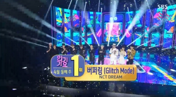 엔시티 드림은 10일 오후 방송된 SBS 음악 프로그램 ‘인기가요’에서 레드벨벳의 ‘필 마이 리듬('Feel My Rhythm)’, (여자)아이들 ‘톰보이(TOMBOY)’를 누르고 신곡 ‘버퍼링(Glitch Mode)’으로 1위를 거머쥐었다.