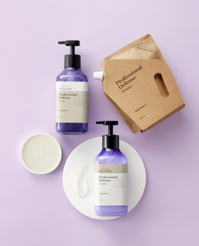 비욘드의 대표 중지성용 데일리 샴푸인 ‘프로페셔널 디펜스 샴푸’는 탄탄한 두피와 모발을 만드는데 도움을 주는 비건 비오틴™ 성분을 담고, 풍부한 영양을 가진 베리류 함량을 기존 제품 대비 2배로 증량한 올인원 비건 샴푸로 새롭게 선보였다. 실리콘 오일과 계면활성제 등을 무첨가했고, 인체 적용시험[2]을 통해 샴푸 사용 후 두피 유분 90.6% 개선 및 세정 효과 8시간 지속을 입증했다.
