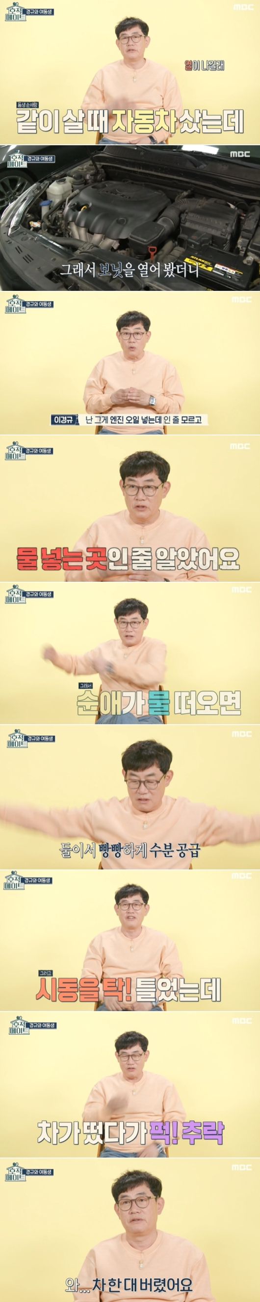 이경규는 "새록새록 옛날 기억이 떠올랐다. 동생이랑 같이 살 때 자동차를 샀는데 자동차가 자꾸 열이 나더라. 그래서 보닛을 열었더니 엔진오일 넣는 통이 있었다. 난 그게 엔진 오일 넣는 통인 줄 모르고 물 넣는 곳인 줄 알았다"라고 말했다.