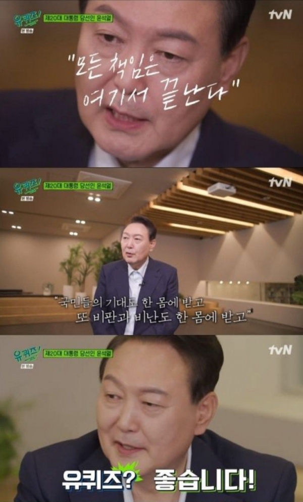 '유퀴즈'는 150회 '어느 날 갑자기' 특집을 꾸려 윤 당선인의 녹화분을 방송했다. '인생의 화두는 여느 날 같던 어느 날 갑자기 뒤바뀌곤 한다'는 문구와 함께 시작한 이날 방송에서 윤 당선인은 첫 순서로 나와 20여 분 동안 진행자 유재석, 조세호와 대화를 나눴다.