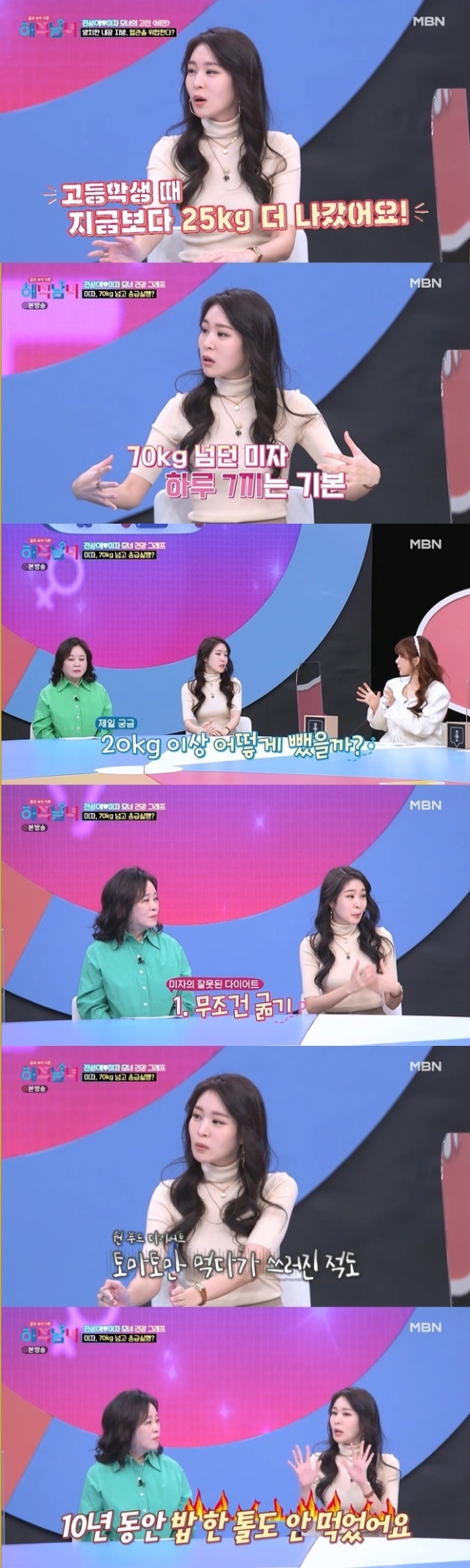 이날 미자는 과거 몸무게가 70kg이 넘었다며 "고등학교 때는 지금보다 25kg이 더 나갔다"라고 했다. 이에 어머니 전성애 역시 "등판이 스케이트장 같았다"라며 공감했다.