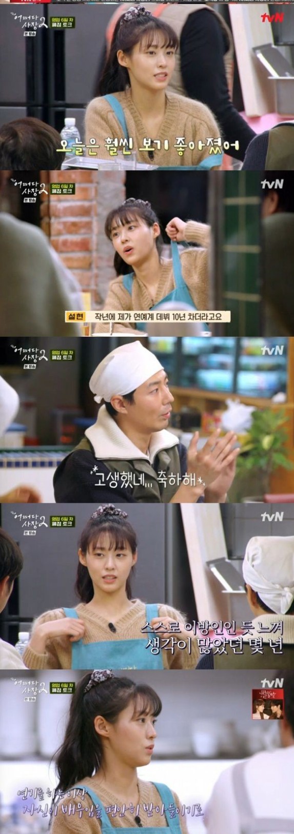 이날 멤버들과 식탁에 모인 설현은 “작년에 제가 연예계 데뷔 10년 차가 됐더라”라며 “가수 활동할 때는 연기 활동 하는 것에 약간 주눅 드는 게 있었다. 이방인이 된 것 같은 기분이었는데 지금은 많이 편해진 것 같다”고 말했다.