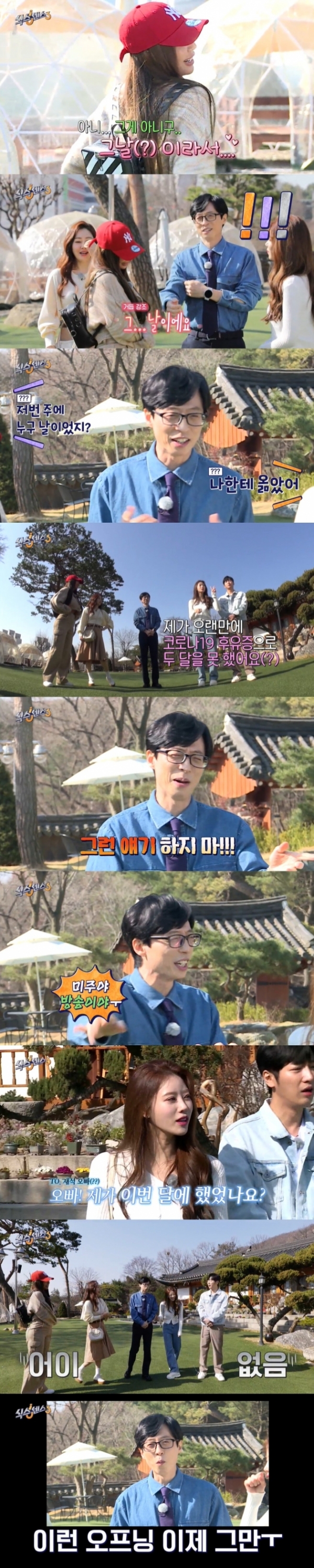 당황한 유재석은 "내가 미안하네"라고 사과했고, 미주는 "언니 건들지 마요 그날이래요"라며 유재석을 나무랐다. 이에 오나라도 "저번주에 누구 날이었지?"라고 질문해 웃음을 안겼다.