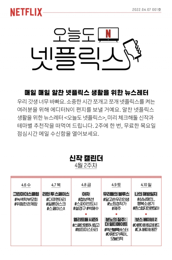 넷플릭스 뉴스레터 ‘오늘도 넷플릭스’는 2022년 4월 7일 첫 호 발행을 마쳤으며, 신작을 비롯해 넷플릭스 속 각종 콘텐츠를 구독자들에게 명확히 설명, 추천하고 있다. 수많은 작품에 휩싸여 도무지 무얼 봐야 할지 모르겠다면, 이를 통해 자신에게 꼭 맞는 작품을 찾아보는 것은 어떨까.