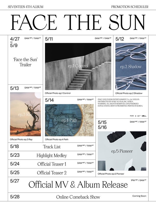 세븐틴은 25일 공식 SNS에 5월 27일 오후 1시 발매되는 정규 4집 '페이스 더 선(Face the Sun)' 프로모션 스케줄러를 게재하며 컴백에 대한 기대감을 더했다.