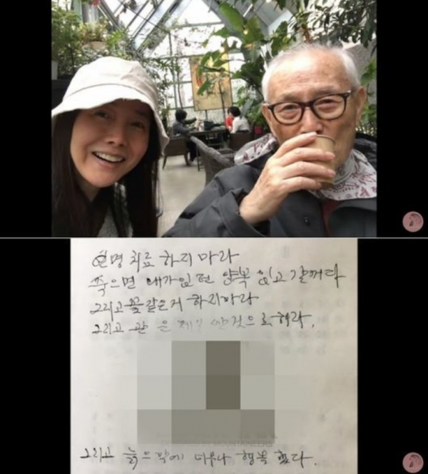 이와 함께 강수지는 부친이 생전에 남긴 쪽지도 공개했다. 해당 쪽지에는 "연명 치료 하지 마라. 죽으면 내가 입던 양복 입고 갈 거다. 그리고 꽃 같은 거 하지 마라. 관은 제일 싼 것으로 해라. 그리고 늘그막에 너무나 행복했다"는 내용이 적혀 있다. 강수지가 유튜브를 통해 부친에 대한 애정을 종종 드러냈던 만큼 팬들의 위로가 이어지고 있다.