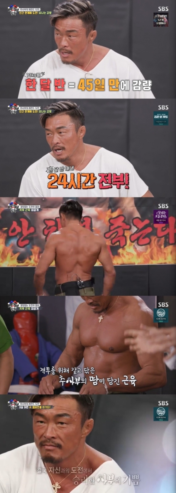 경기를 위해 체중감량을 했던 것에 대해 얘기하기도 했다. 추성훈은 "이번에도 한달 반만에 13㎏ 정도를 감량했다"라며 "체중 측정을 하고 호텔방에 들어오니깐 손이 말리더라"라고 말해 얘기해 멤버들의 안타까움을 샀다.