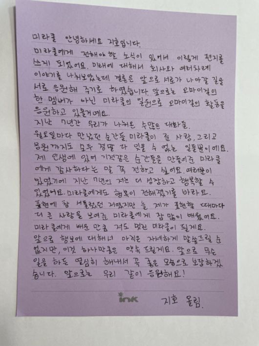 [스타인뉴스 양경모 기자] 그룹 오마이걸 탈퇴 소식을 알린 지호가 손편지로 작별 인사를 전했다.